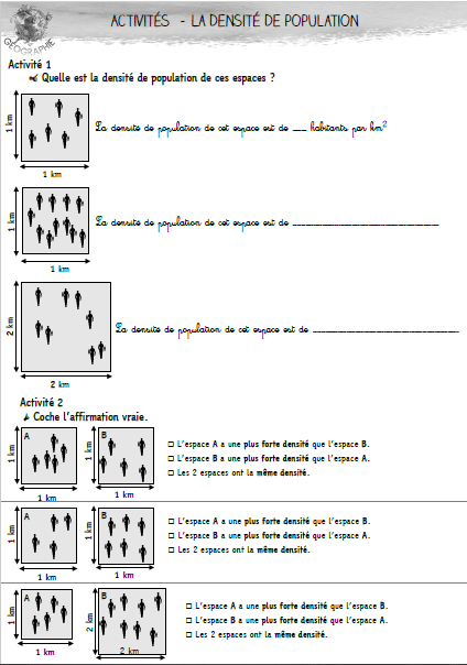 Activité 1 : dans la cour, on trace à la craie des carrés de différentes superficies (1 m² et 4 m² par exemple) et on fait varier le nombre d’élèves à l’intérieur. On montre aux élèves que la densité n’est pas liée uniquement au nombre d’habitants mais également à la superficie du territoire considéré.