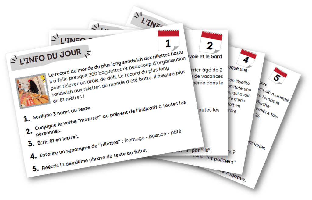 La première partie du rituel est constituée de la lecture et d’une rapide vérification orale de la compréhension du texte puis les élèves travaillent sur les questions proposées. Chaque fiche regroupe une question de grammaire, d’orthographe, de conjugaison et de vocabulaire.