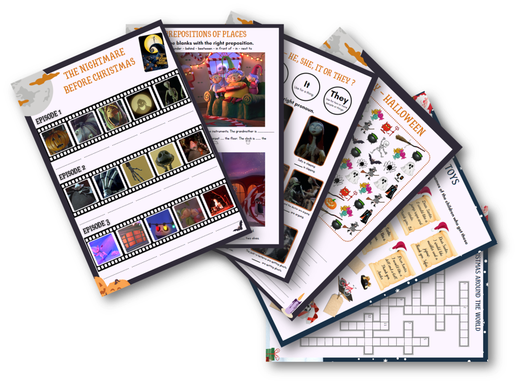 Ce film est l’occasion parfaite d’aborder les fêtes traditionnelles d’Halloween et de Noël. Je travaille également les pronoms ainsi que les prépositions de lieux.