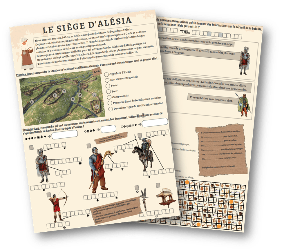 - L’une sur le siège d’Alésia avec une approche un peu escape-game. L’élève incarne une jeune gauloise qui doit tenter de s’échapper d’Alésia au moment de son siège : le document élève et la correction.
