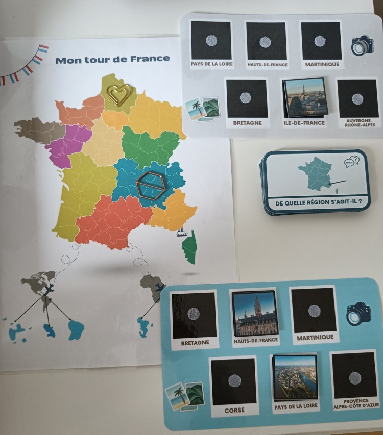 • Un jeu un peu plus long dans lequel il faut répondre à des questions. Chaque joueur doit collecter l’ensemble des photos des régions correspondant à son album. Au départ, chaque joueur se positionne dans la région de son choix. A chaque tour, le joueur doit répondre à une question. S’il répond correctement il peut avancer d’une case ou remporter une photo à positionner dans son album. Evidemment, l’enfant doit collecter les photos de sa planche d’album. S’il propose une réponse erronée, il ne se déplace pas. On peut autoriser les échanges de photos pour diminuer la durée du jeu.